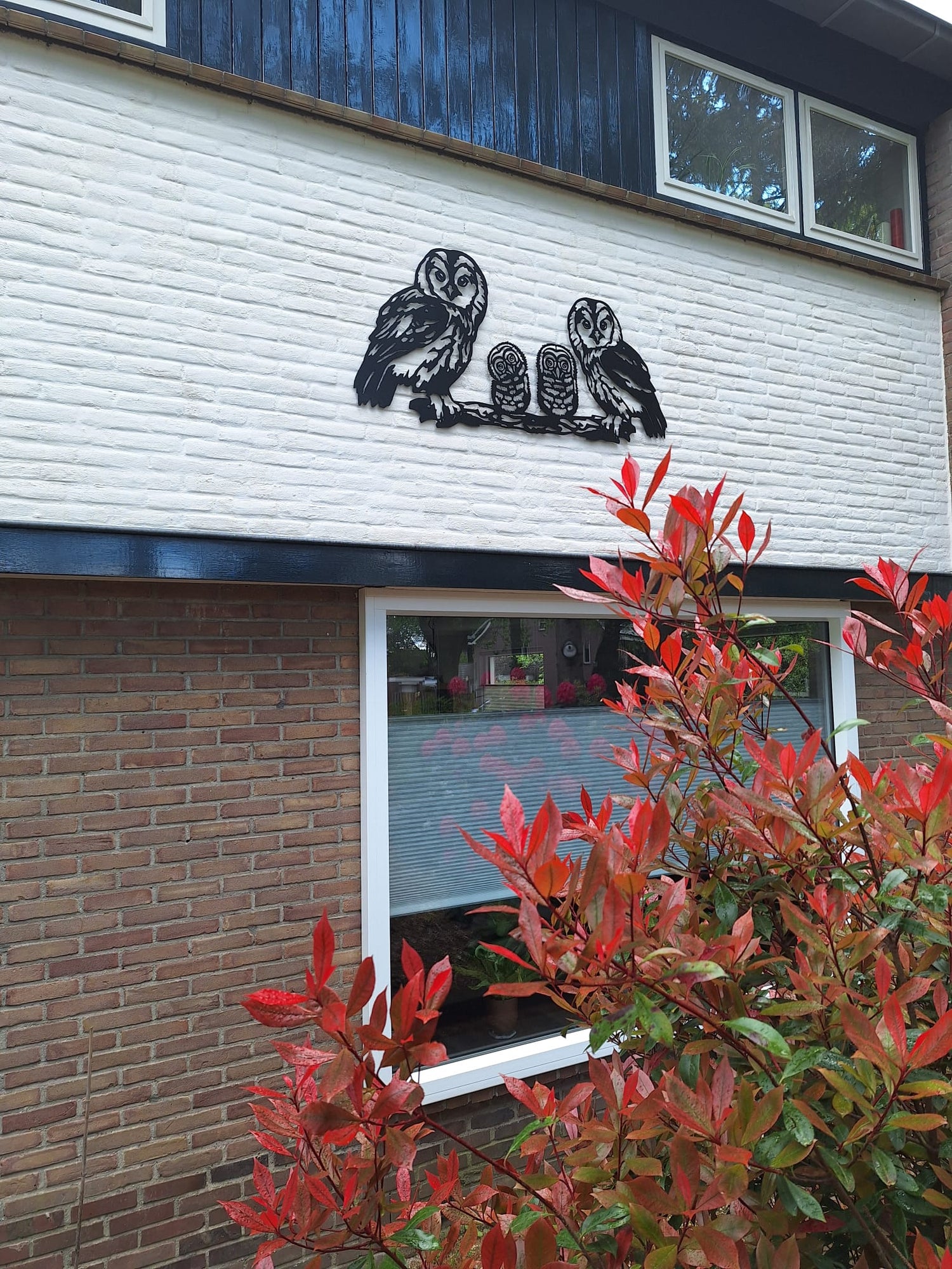 For this customer we made a black powder coated tawny owl family for the facade of a house. The family consists of 2 parents and 2 young. The same composition as the family and the family with tawny owls that lives in the backyard. The owls are approx. 1.5 meters wide.